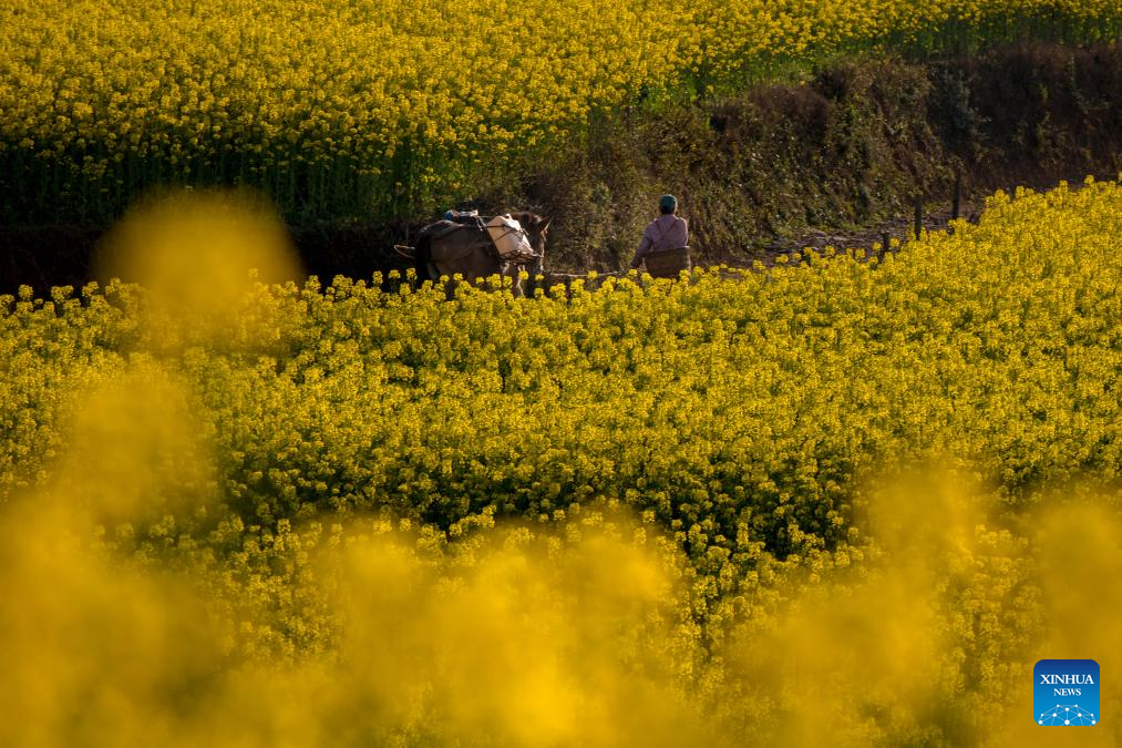 LUOPING, 11 marzo, 2025 (Xinhua) -- Un aldeano camina en los campos de flores de col, en la villa de Gegang del distrito de Luoping, en la provincia de Yunnan, en el suroeste de China, el 11 de marzo de 2025. (Xinhua/Peng Yikai)