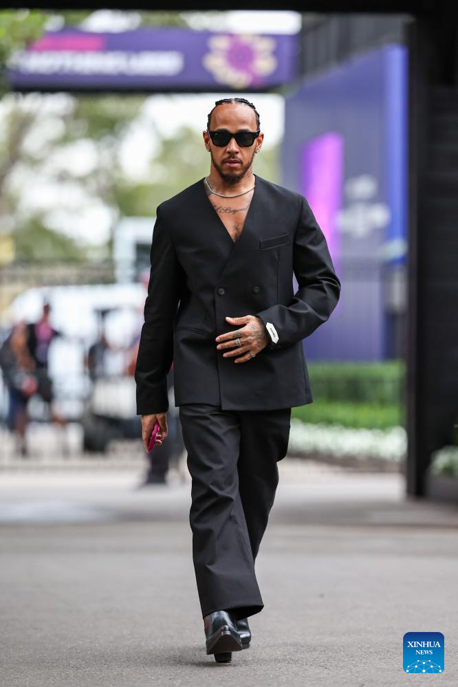 MELBOURNE, 13 marzo, 2025 (Xinhua) -- El piloto británico de la escudería Ferrari, Lewis Hamilton, llega al paddock previo al Gran Premio de Australia de Fórmula Uno, en Albert Park, en Melbourne, Australia, el 13 de marzo de 2025. (Xinhua/Qian Jun)