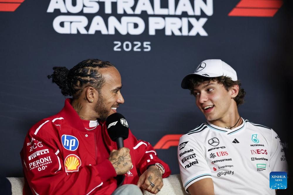 MELBOURNE, 13 marzo, 2025 (Xinhua) -- El piloto británico de la escudería Ferrari, Lewis Hamilton (i), y el piloto italiano de la escudería Mercedes, Andrea Kimi Antonelli, asisten a la conferencia de prensa previo al Gran Premio de Australia de Fórmula Uno, en Albert Park, en Melbourne, Australia, el 13 de marzo de 2025. (Xinhua/Qian Jun)
