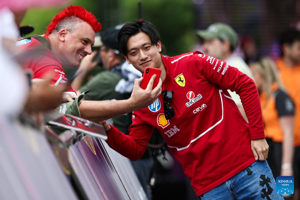 MELBOURNE, 13 marzo, 2025 (Xinhua) -- El piloto chino de la escudería Ferrari, Zhou Guanyu, interactúa con aficionados en el Melbourne Walk, previo al Gran Premio de Australia de Fórmula Uno, en Albert Park, en Melbourne, Australia, el 13 de marzo de 2025. (Xinhua/Qian Jun)