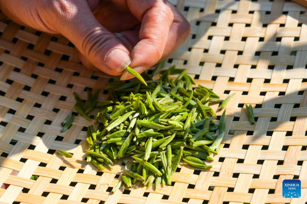 NANJING, 17 marzo, 2025 (Xinhua) -- Una agricultora muestra hojas de té recién recolectadas en un jardín de té de un parque de demostración agrícola, en el distrito de Wuzhong, en la ciudad de Suzhou, en la provincia de Jiangsu, en el este de China, el 17 de marzo de 2025. La temporada de cosecha de Biluochun, una de las principales variedades de té en China y la especialidad de Suzhou, ha llegado recientemente. Los agricultores en el distrito de Wuzhong de Suzhou se encuentran ocupados cosechando hojas de té previo al Festival Qingming para producir el té de Mingqian (literalmente "pre-Qingming"), que se elabora con los primeros brotes de té de la primavera y se considera de alta calidad. (Xinhua/Li Bo)