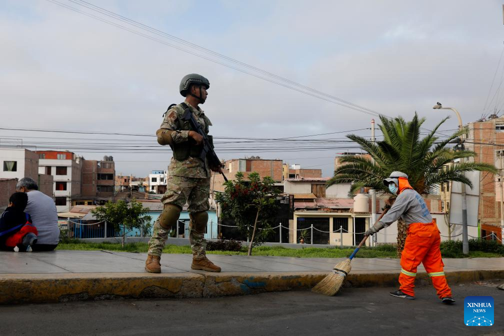 Un soldado monta guardia mientras una persona barre una calle, en el distrito de Chorrillos, en el sur de Lima, Perú, el 19 de marzo de 2025. El Gobierno peruano declaró el lunes, por 30 días, el estado de emergencia en Lima Metropolitana y su vecina provincia del Callao para hacer frente al incremento de las acciones criminales que se han venido registrando en los últimos días, que incluyen homicidios. (Xinhua/Mariana Bazo)