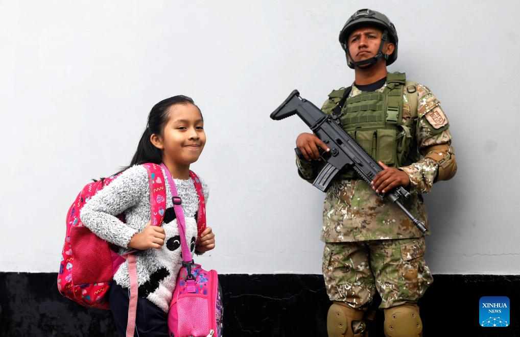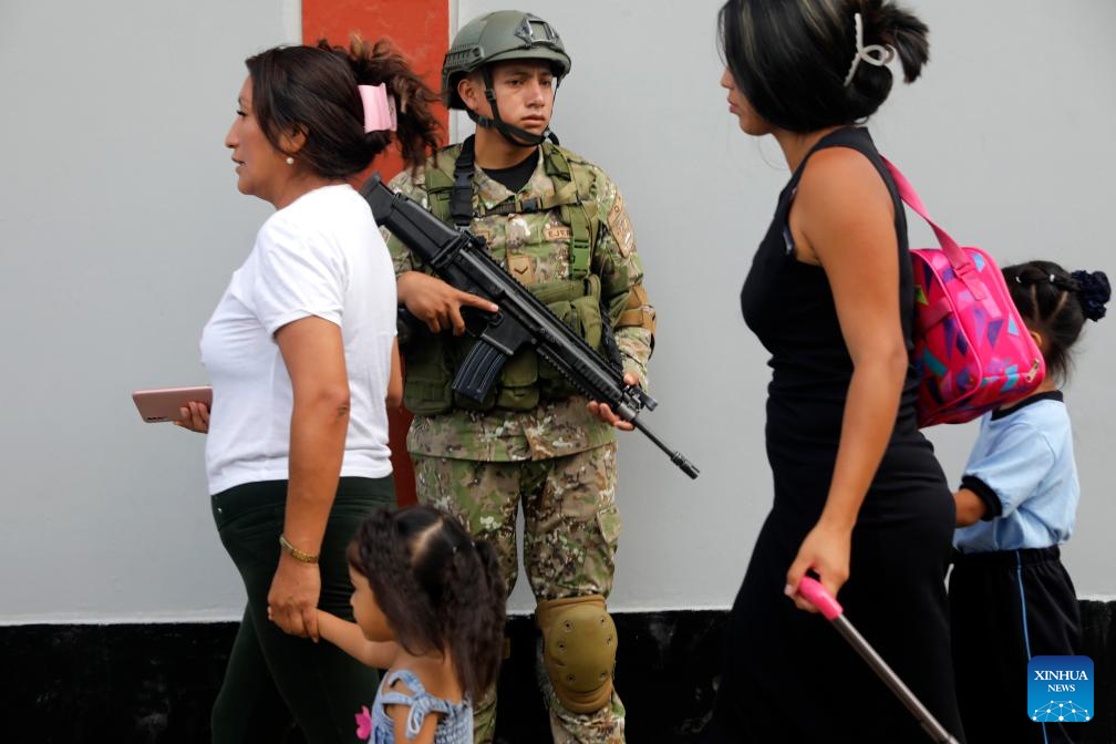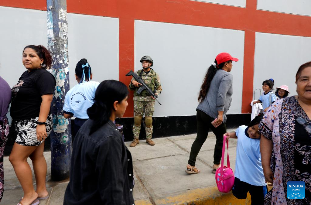 Un soldado monta guardia mientras estudiantes acompañados de adultos ingresan a un colegio, en el distrito de Chorrillos, en el sur de Lima, Perú, el 19 de marzo de 2025. El Gobierno peruano declaró el lunes, por 30 días, el estado de emergencia en Lima Metropolitana y su vecina provincia del Callao para hacer frente al incremento de las acciones criminales que se han venido registrando en los últimos días, que incluyen homicidios. (Xinhua/Mariana Bazo)