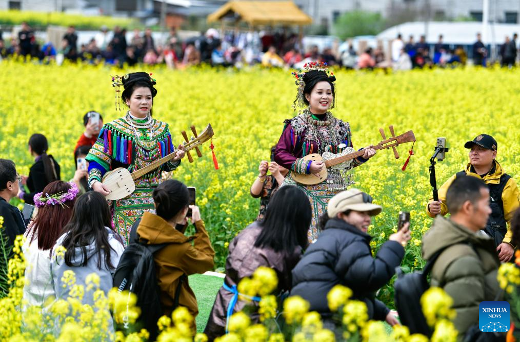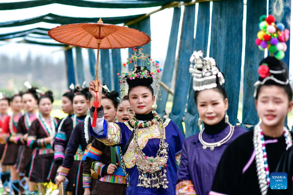 RONGJIANG, 17 marzo, 2025 (Xinhua) -- Imagen del 16 de marzo de 2025 de aldeanas en trajes étnicos participando en un desfile de modas rural, en el distrito de Rongjiang, en la provincia de Guizhou, en el suroeste de China. Un desfile de modas en una aldea, presentando atuendos étnicos se llevó a cabo aquí el domingo, brindándole a los asistentes una fiesta colorida de culturas étnicas. (Xinhua/Yang Wenbin)