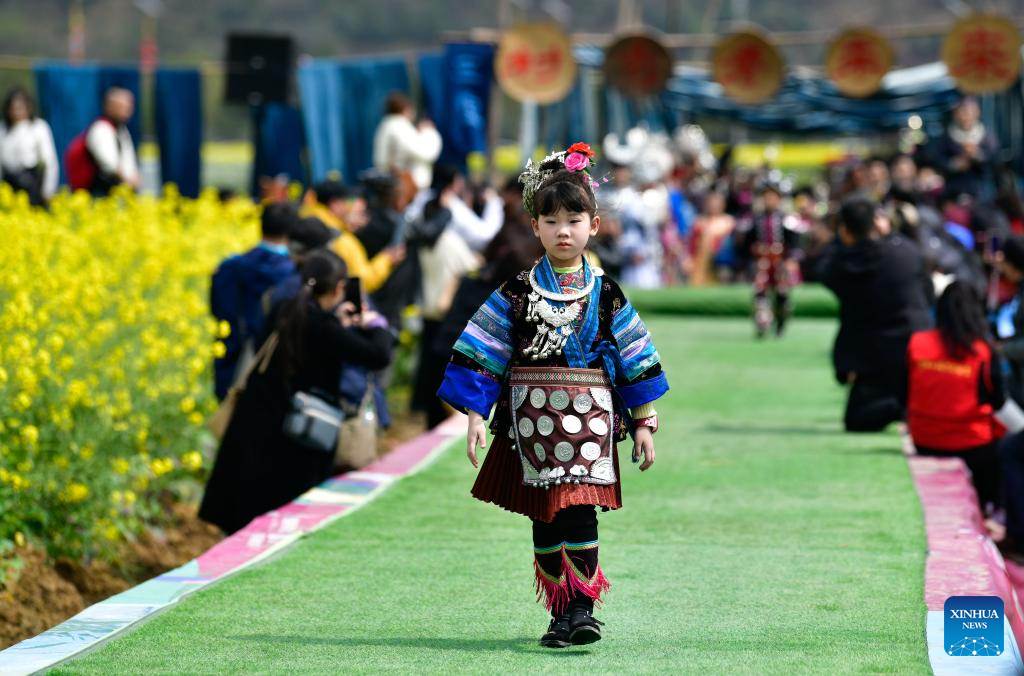 RONGJIANG, 17 marzo, 2025 (Xinhua) -- Imagen del 16 de marzo de 2025 de una niña en un traje étnico participando en un desfile de modas rural, en el distrito de Rongjiang, en la provincia de Guizhou, en el suroeste de China. Un desfile de modas en una aldea, presentando atuendos étnicos se llevó a cabo aquí el domingo, brindándole a los asistentes una fiesta colorida de culturas étnicas. (Xinhua/Yang Wenbin)