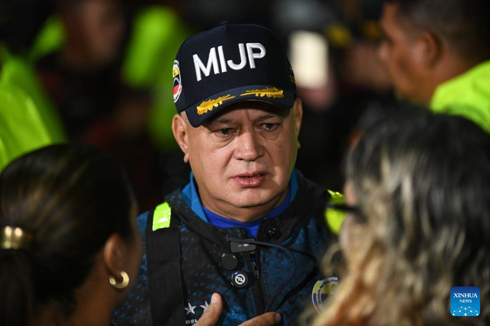 LA GUAIRA, 24 marzo, 2025 (Xinhua) -- El ministro de Interior, Justicia y Paz venezolano, Diosdado Cabello, recibe un avión con migrantes venezolanos deportados desde Estados Unidos a bordo en el Aeropuerto Internacional Simón Bolívar, en Maiquetía, estado de La Guaira, Venezuela, en las primeras horas del 24 de marzo de 2025. Un grupo de 199 migrantes venezolanos deportados desde Estados Unidos llegaron la madrugada del lunes al Aeropuerto Internacional de Maiquetía en Venezuela luego de haber transbordado en Honduras, a bordo de un vuelo de la aerolínea estatal Conviasa. (Xinhua/Marcos Salgado)