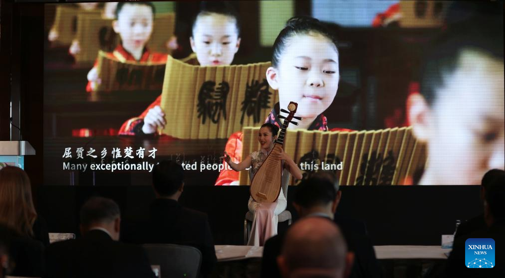 LONDRES, 3 abril, 2025 (Xinhua) -- Una artista realiza una presentación durante un evento promocional de cultura y turismo para la provincia de Hunan de China, en Londres, Reino Unido, el 3 de abril de 2025. La provincia de Hunan, en el centro de China, conocida por los imponentes pilares naturales en Zhangjiajie que inspiraron la película Avatar, exhibió sus ricos recursos culturales y turísticos en Londres el jueves. Decenas de funcionarios gubernamentales y representantes de la industria turística de China y Reino Unido asistieron al evento promocional, cuyo objetivo era explorar posibles colaboraciones en los ámbitos de la cultura y el turismo. (Xinhua/Li Ying)