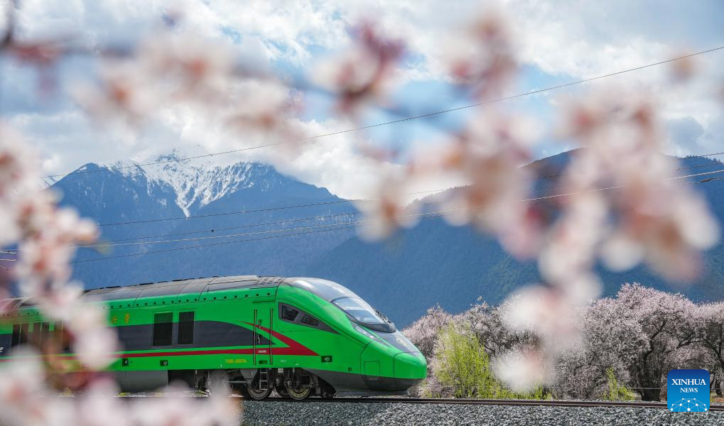 NYINGCHI, 3 abril, 2025 (Xinhua) -- Imagen del 2 de abril de 2025 de un tren bala Fuxing circulando por la sección de Nyingchi del ferrocarril Lhasa-Nyingchi, en la región autónoma de Xizang, en el suroeste de China. (Xinhua/Tenzin Nyida)