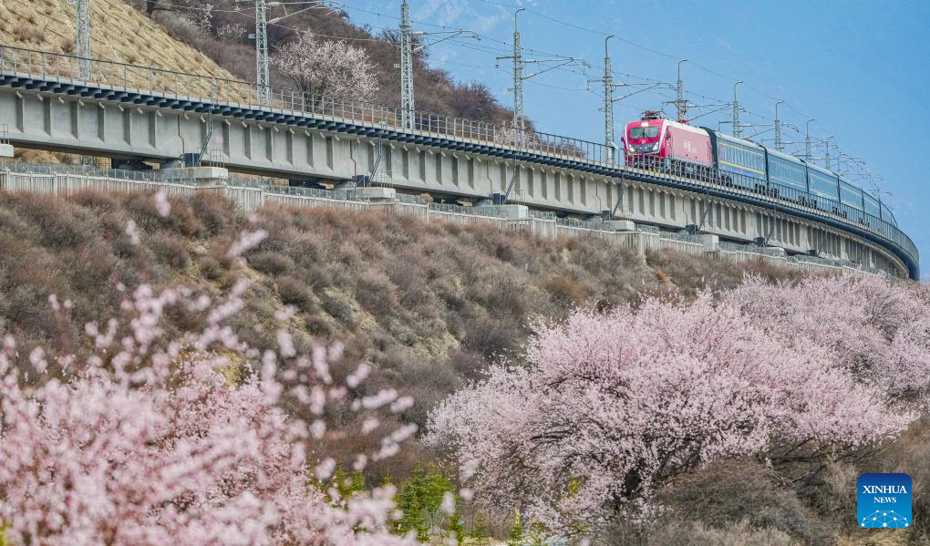NYINGCHI, 3 abril, 2025 (Xinhua) -- Imagen del 1 de abril de 2025 de un tren circulando por la sección de Nyingchi del ferrocarril Lhasa-Nyingchi, en la región autónoma de Xizang, en el suroeste de China. (Xinhua/Tenzin Nyida)
