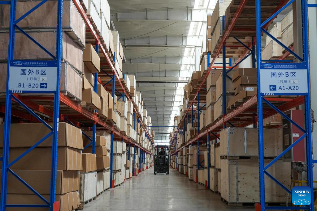 JINAN, 4 abril, 2025 (Xinhua) -- Imagen del 2 de abril de 2025 de un trabajador transportando productos en una fábrica de equipos de fitness, en el distrito de Ningjin, en la provincia de Shandong, en el este de China. El distrito de Ningjin es uno de los principales centros comerciales de fabricación de equipos de fitness de China y abasteciendo a los mercados mundiales en más de 170 países y regiones. El distrito produce más de 1.000 variantes de productos en más de 400 categorías, como máquinas aeróbicas, sistemas de entrenamiento de fuerza y aparatos de rehabilitación. Con 2.509 empresas registradas (20 de ellas fabricantes a gran escala), el valor total de la producción de la industria de equipos de fitness en Ningjin alcanzó los 13.9 billones de yuanes (unos 1.9 billones de dólares estadounidenses) en 2024. (Xinhua/Zhu Zheng)
