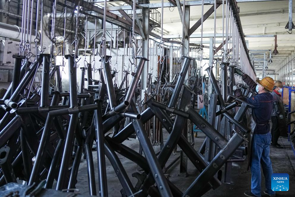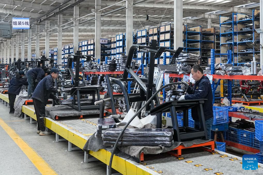 JINAN, 4 abril, 2025 (Xinhua) -- Imagen del 2 de abril de 2025 de personas trabajando en una fábrica de equipos de gimnasia, en el distrito de Ningjin, en la provincia de Shandong, en el este de China. El distrito de Ningjin es uno de los principales centros comerciales de fabricación de equipos de fitness de China y abasteciendo a los mercados mundiales en más de 170 países y regiones. El distrito produce más de 1.000 variantes de productos en más de 400 categorías, como máquinas aeróbicas, sistemas de entrenamiento de fuerza y aparatos de rehabilitación. Con 2.509 empresas registradas (20 de ellas fabricantes a gran escala), el valor total de la producción de la industria de equipos de fitness en Ningjin alcanzó los 13.9 billones de yuanes (unos 1.9 billones de dólares estadounidenses) en 2024. (Xinhua/Zhu Zheng)