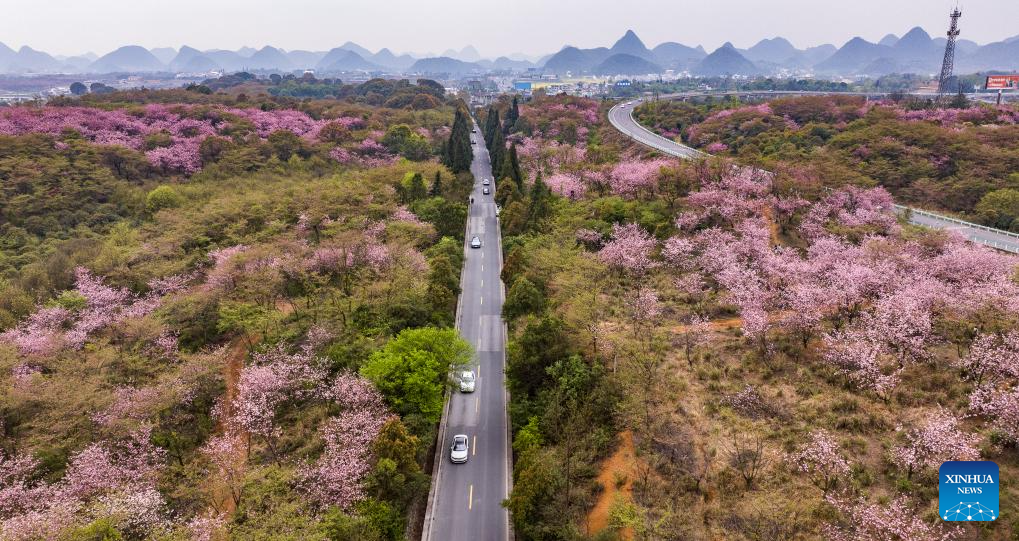 QINGZHEN, 6 abril, 2025 (Xinhua) -- Vista aérea tomada con un dron el 5 de abril de 2025 de flores a lo largo de una carretera, en el municipio de Hongfenghu, en la ciudad de Qingzhen, en la provincia de Guizhou, en el suroeste de China. (Xinhua/Tao Liang)