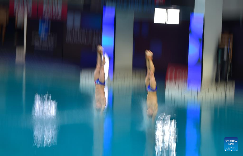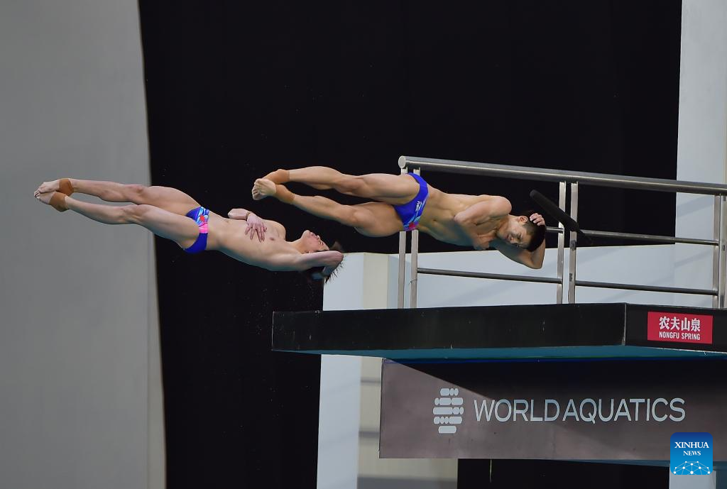 GUADALAJARA, 6 abril, 2025 (Xinhua) -- Imagen del 5 de abril de 2025 de Zhu Zifeng (i)/Cheng Zilong, de China, compitiendo durante la final de 10 metros sincronizados masculinos en la Copa Mundial de Clavados, en Guadalajara, estado de Jalisco, México. (Xinhua/Alejandro Acosta)
