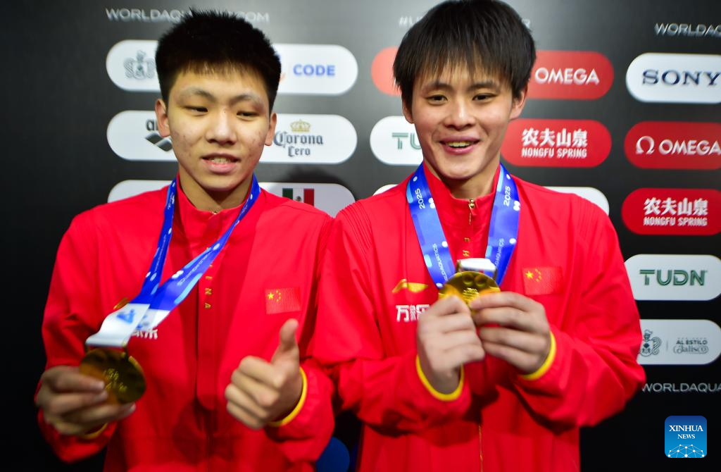 GUADALAJARA, 6 abril, 2025 (Xinhua) -- Imagen del 5 de abril de 2025 de Zhu Zifeng (d)/Cheng Zilong, de China, festejando después de la ceremonia de premiación de la final de 10 metros sincronizados masculinos en la Copa Mundial de Clavados, en Guadalajara, estado de Jalisco, México. (Xinhua/Alejandro Acosta)