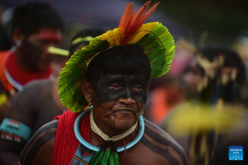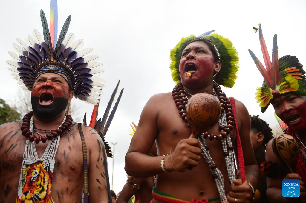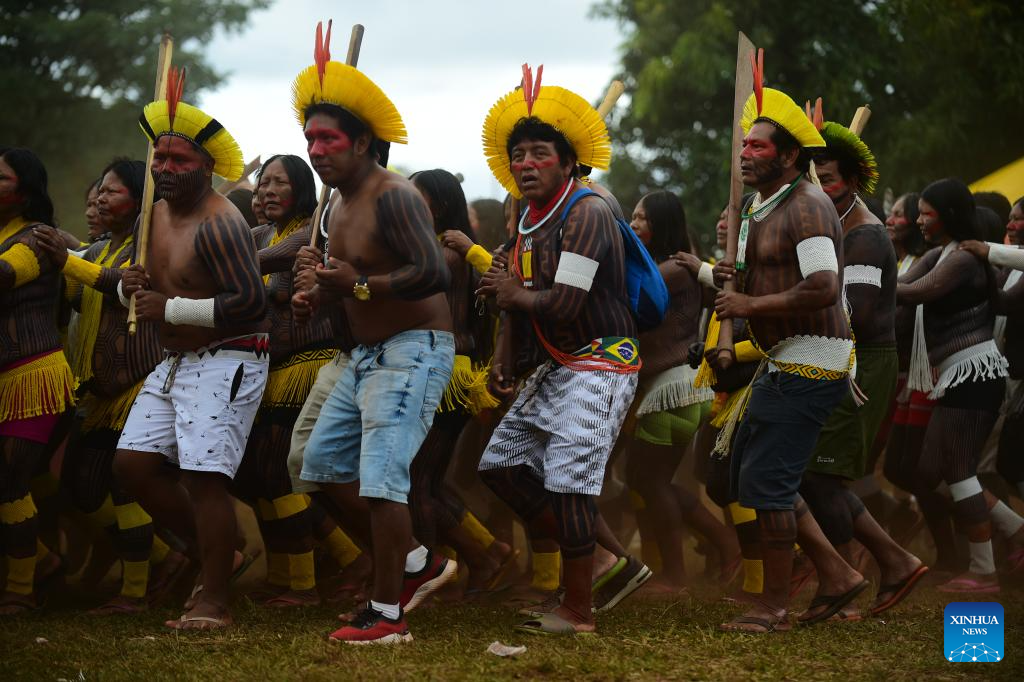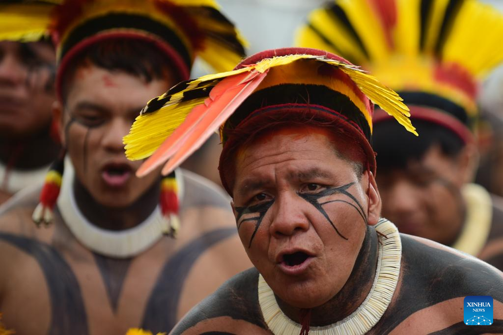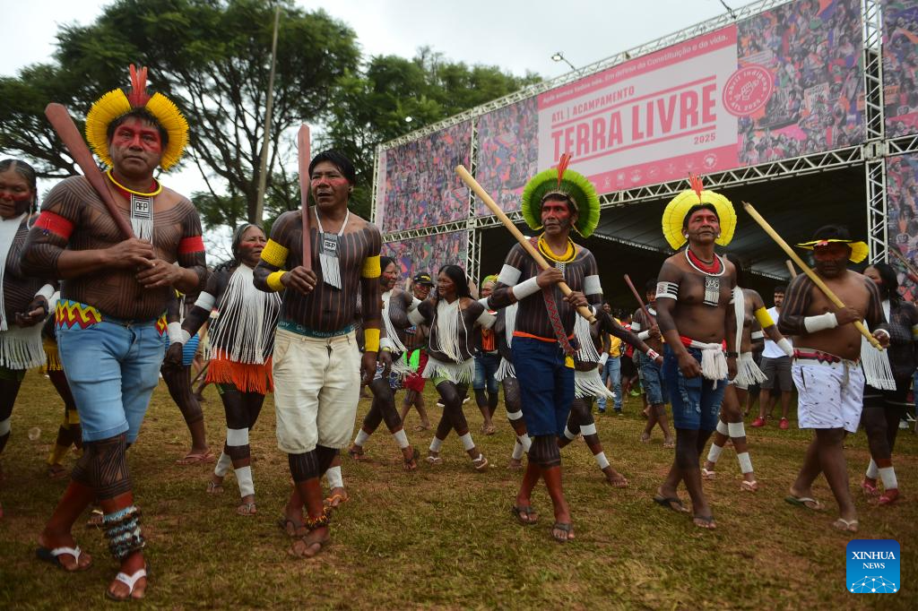 BRASILIA, 7 abril, 2025 (Xinhua) -- Personas indígenas participan en la apertura de la 21 edición del Campamento "Tierra Libre", en Brasilia, Brasil, el 7 de abril de 2025. (Xinhua/Lucio Tavora)