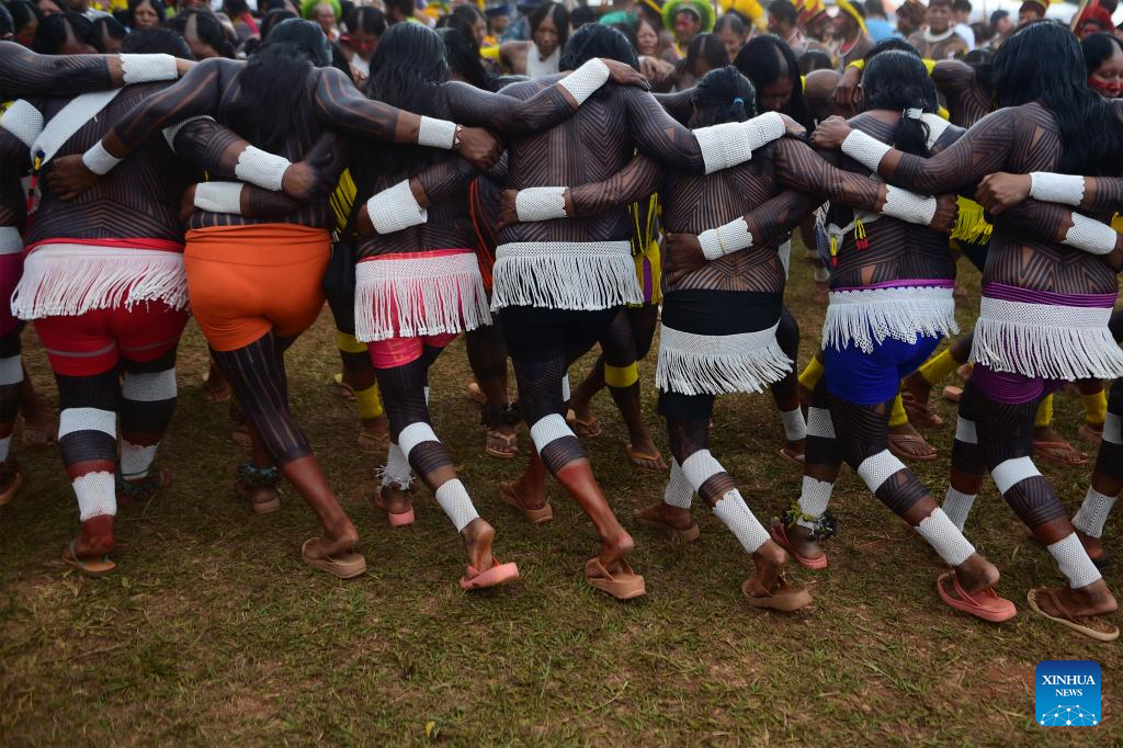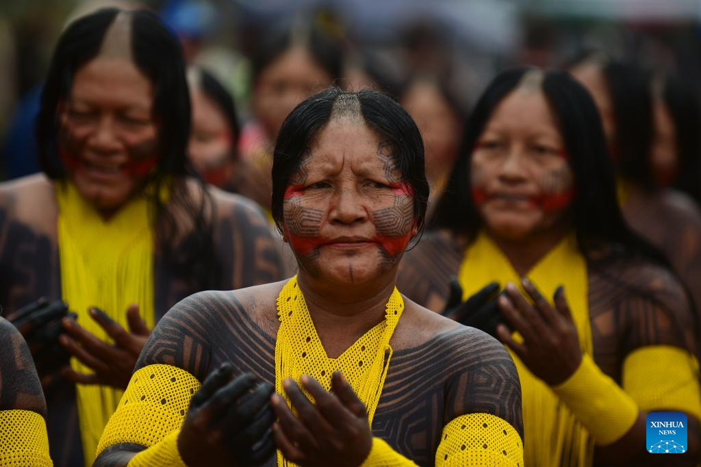 BRASILIA, 7 abril, 2025 (Xinhua) -- Mujeres indígenas participan en la apertura de la 21 edición del Campamento "Tierra Libre", en Brasilia, Brasil, el 7 de abril de 2025. (Xinhua/Lucio Tavora)