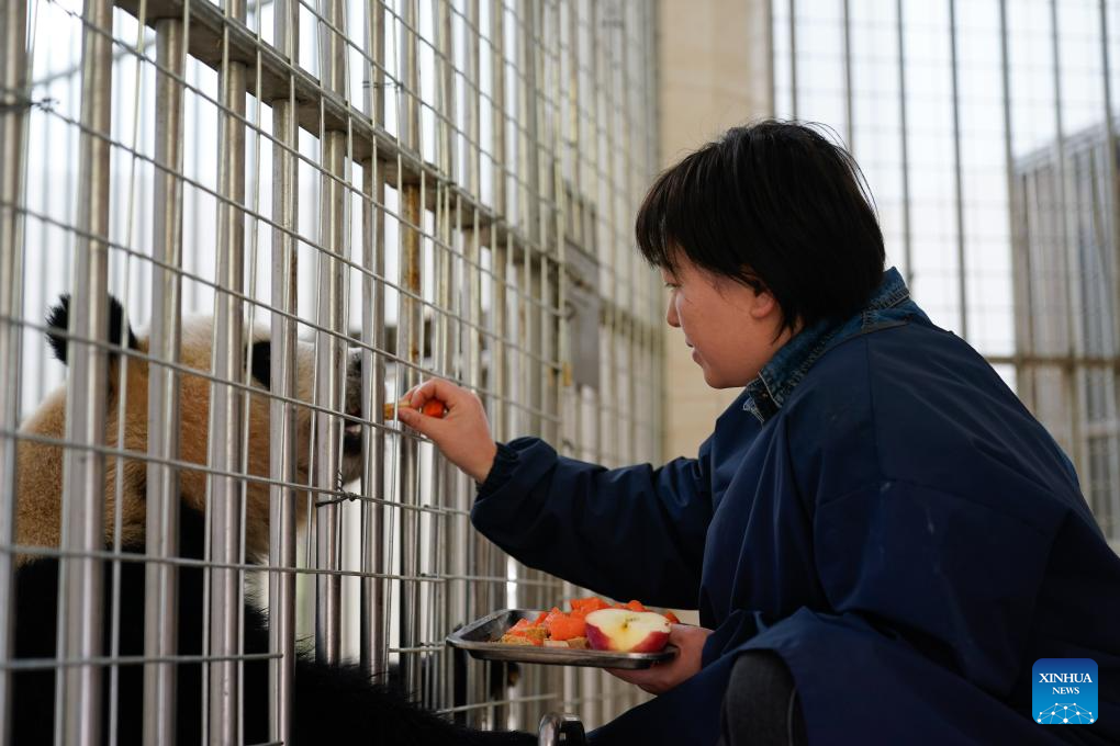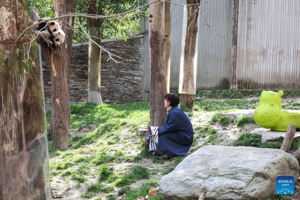 CHENGDU, 7 abril, 2025 (Xinhua) -- Imagen del 27 de marzo de 2025 de la cuidadora de pandas gigantes, Li Rong, interactuando con cachorros de panda mientras los alimenta en la base de pandas gigantes de Shenshuping de la Reserva Natural Nacional de Wolong, en la provincia de Sichuan, en el suroeste de China. Li Rong es una cuidadora en la base de pandas gigantes de Shenshuping de la Reserva Natural Nacional de Wolong. Cuando habla sobre su trabajo, ella dice: "Este es un trabajo algo exigente, pero muy gratificante. Gran parte de mi buen humor proviene del tiempo que paso con los pandas gigantes, considerados el tesoro nacional de China." (Xinhua/Xu Bingjie)