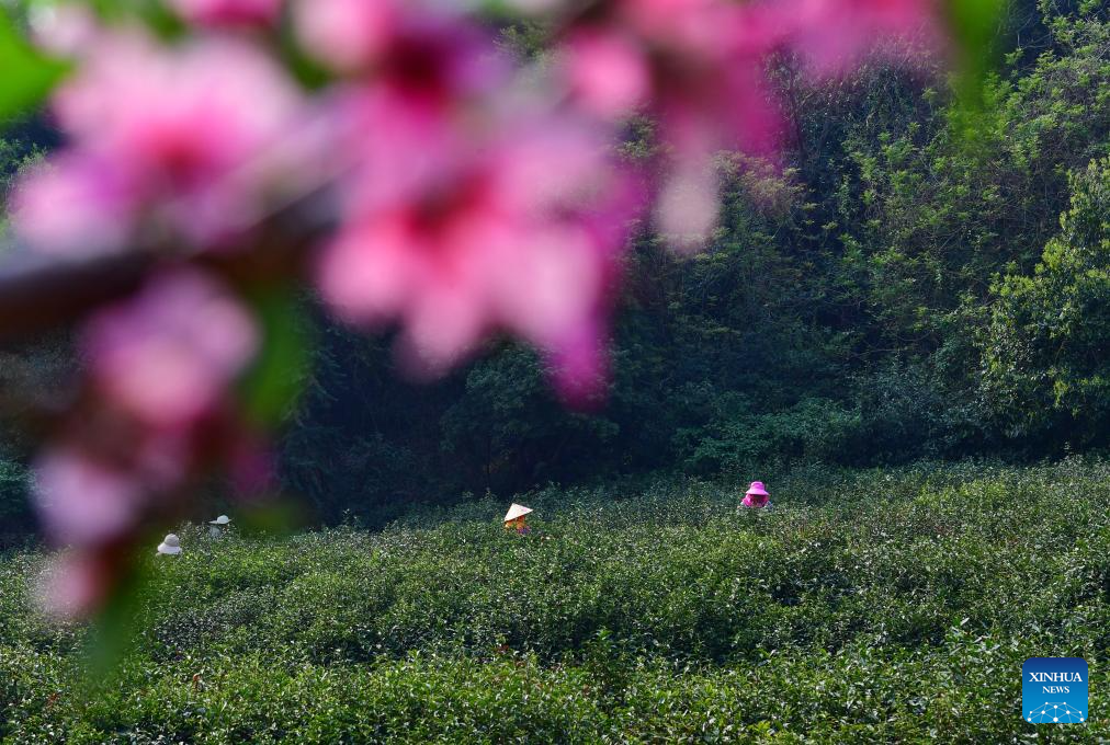BEIJING, 10 abril, 2025 (Xinhua) -- Imagen del 9 de abril de 2025 de agricultores recolectando hojas de té en un jardín de té, en el distrito de Xuan'en, en la provincia de Hubei, en el centro de China. (Xinhua/Chen Xukai)