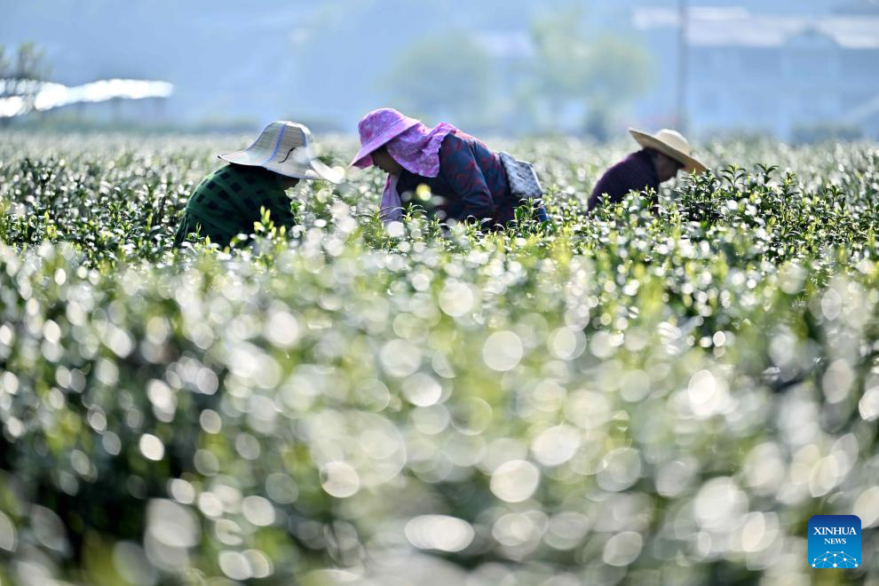BEIJING, 10 abril, 2025 (Xinhua) -- Imagen del 9 de abril de 2025 de agricultores recolectando hojas de té en un jardín de té, en Wuxi, en la provincia de Jiangsu, en el este de China. (Xinhua/Huan Yueliang)