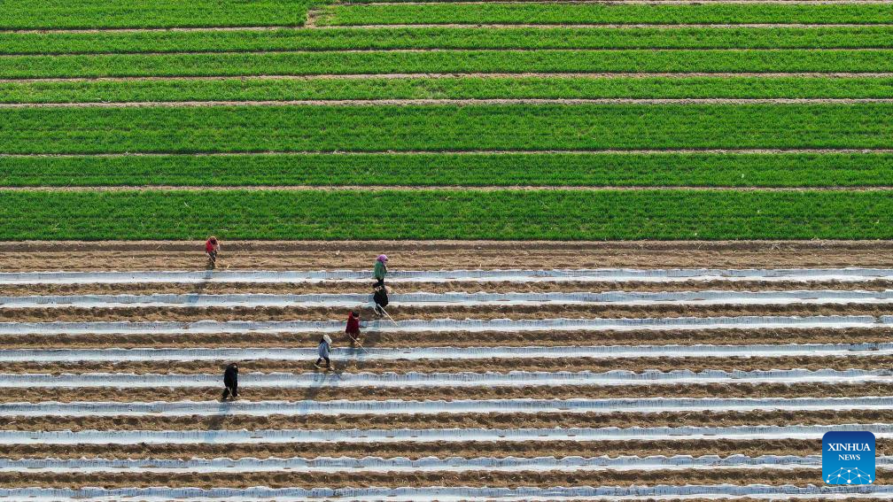 BEIJING, 10 abril, 2025 (Xinhua) -- Vista aérea tomada con un dron el 9 de abril de 2025 de agricultores cubriendo un campo, en la ciudad de Zunhua, en la provincia de Hebei, en el norte de China. (Xinhua/Li Mancang)