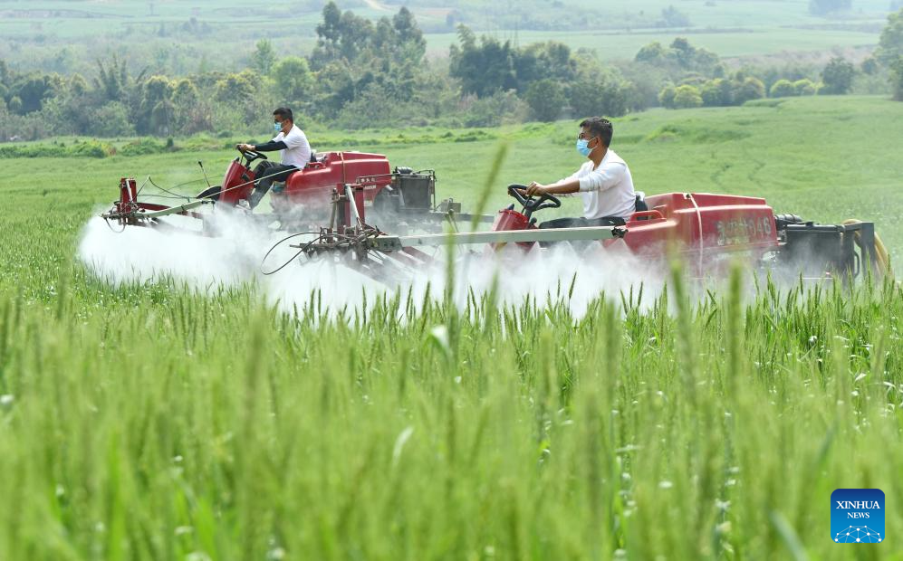 BEIJING, 10 abril, 2025 (Xinhua) -- Imagen del 9 de abril de 2025 de personas conduciendo máquinas rociadoras en un campo, en el distrito de Shuangliu, en la ciudad de Chengdu, en la provincia de Sichuan, en el suroeste de China. (Xinhua/Li Xiangyu)