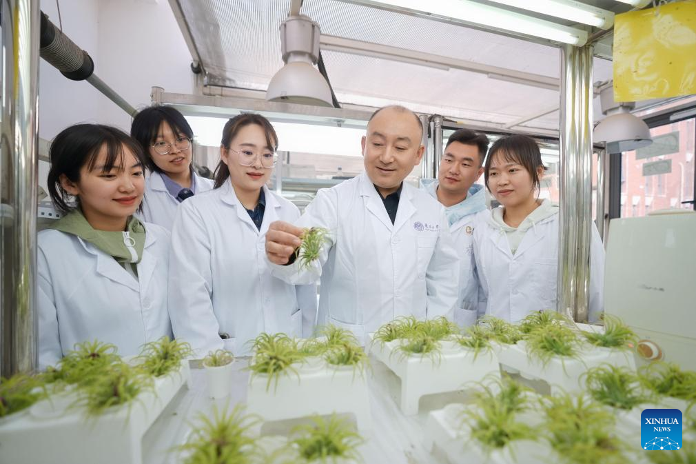 TIANJIN, 10 abril, 2025 (Xinhua) -- Imagen del 9 de abril de 2025 de investigadores de la Facultad de Ciencias Ambientales e Ingeniería de la Universidad Nankai realizando un experimento de exposición a la simulación de plantas en la Universidad de Nankai, en Tianjin, en el norte de China. Un estudio conjunto dirigido por científicos chinos ha demostrado que las hojas de las plantas pueden absorber y acumular microplásticos transportados por el aire, lo que revela una vía directa de entrada de estos contaminantes en la cadena alimentaria y el organismo humano. (Xinhua/Universidad de Nankai)