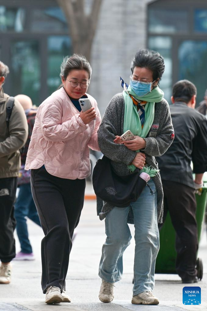 BEIJING, 12 abril, 2025 (Xinhua) -- Personas caminan por una calle, en Beijing, capital de China, el 12 de abril de 2025. Muchas partes del norte de China están experimentando vientos huracanados y descensos de temperatura el sábado. (Xinhua/Li Xin)