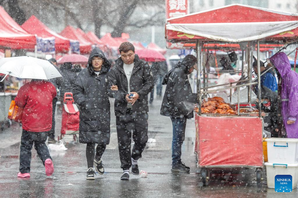 BEIJING, 12 abril, 2025 (Xinhua) -- Personas visitan un mercado en medio de la nieve, en Qiqihar, en la provincia de Heilongjiang, en el noreste de China, el 12 de abril de 2025. Muchas partes del norte de China están experimentando vientos huracanados y descensos de temperatura el sábado. (Xinhua/Wang Yonggang)