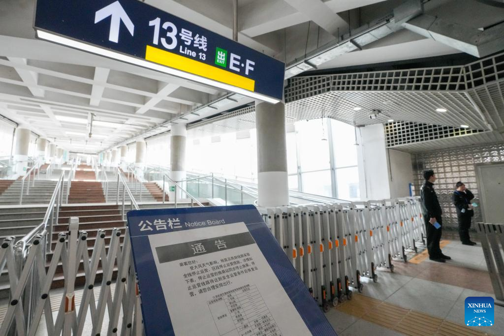 BEIJING, 12 abril, 2025 (Xinhua) -- Un aviso publicado en la estación de Xizhimen del Metro de Beijing anuncia la suspensión de algunas líneas ferroviarias debido a los fuertes vientos, en Beijing, capital de China, el 12 de abril de 2025. Muchas partes del norte de China están experimentando vientos huracanados y descensos de temperatura el sábado. (Xinhua/Ju Huanzong)