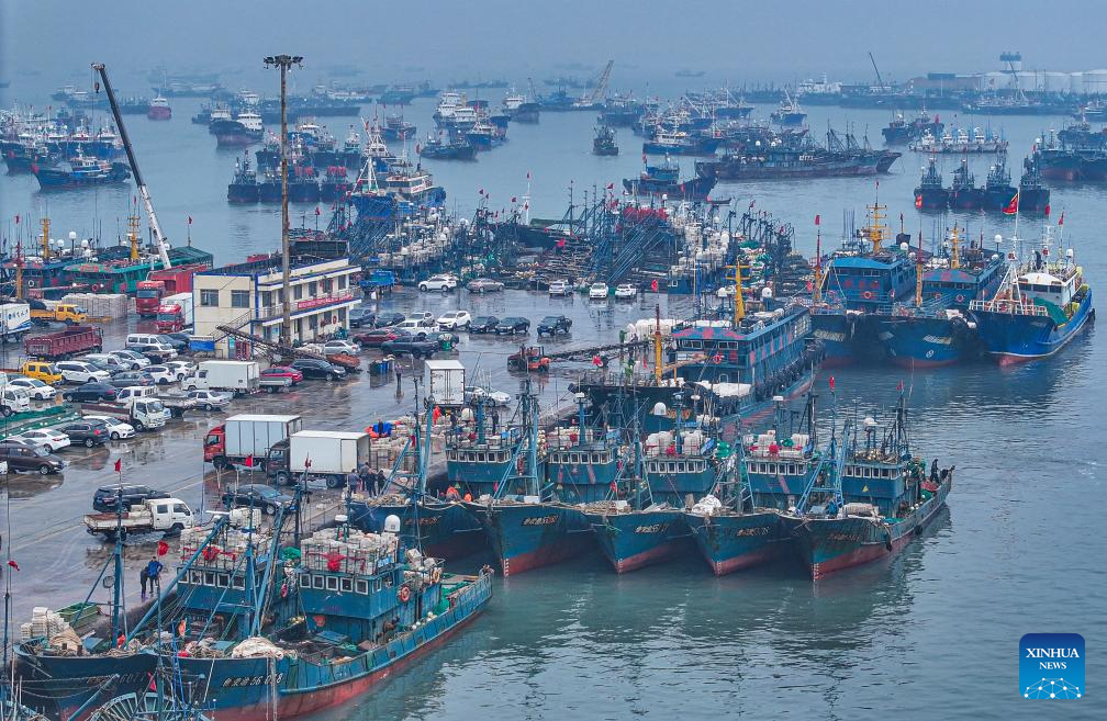 BEIJING, 12 abril, 2025 (Xinhua) -- Vista aérea tomada con un dron el 12 de abril de 2025 de barcos pesqueros atracados en un puerto para protegerse de los fuertes vendavales, en Rongcheng, en la provincia de Shandong, en el este de China. Muchas partes del norte de China están experimentando vientos huracanados y descensos de temperatura el sábado. (Xinhua/Li Xinjun)