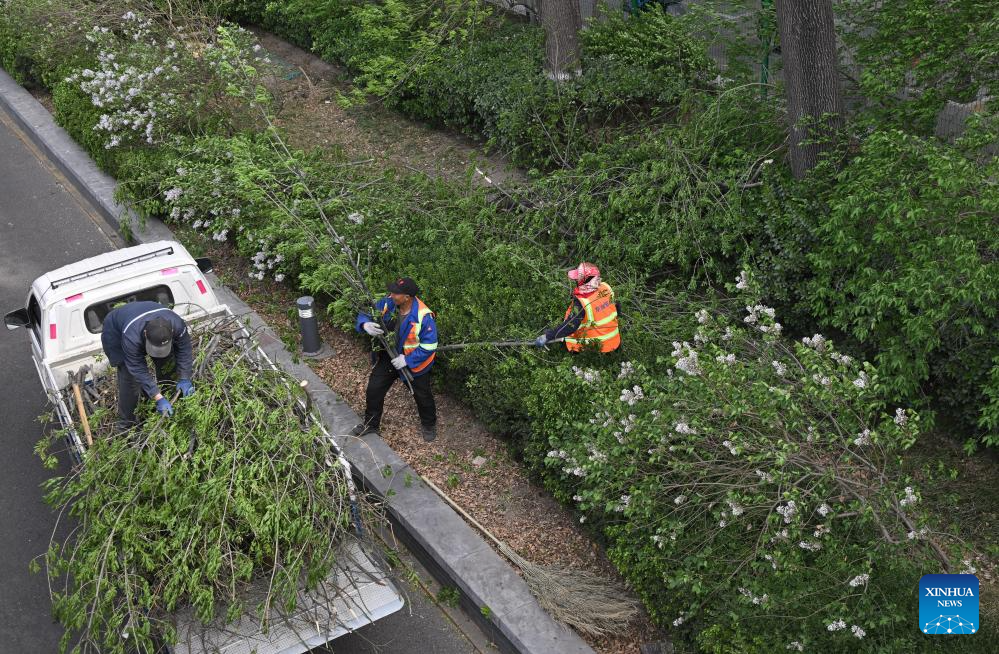 BEIJING, 12 abril, 2025 (Xinhua) -- Trabajadores retiran ramas caídas por los fuertes vientos, en Beijing, capital de China, el 12 de abril de 2025. Muchas partes del norte de China están experimentando vientos huracanados y descensos de temperatura el sábado. (Xinhua/Jin Liangkuai)