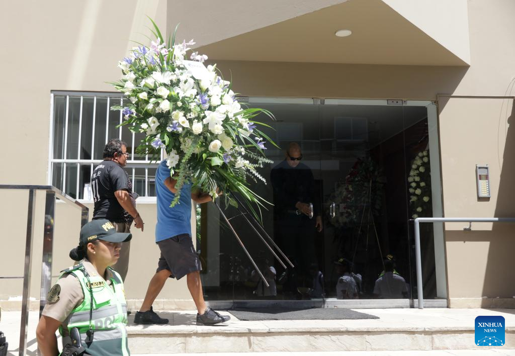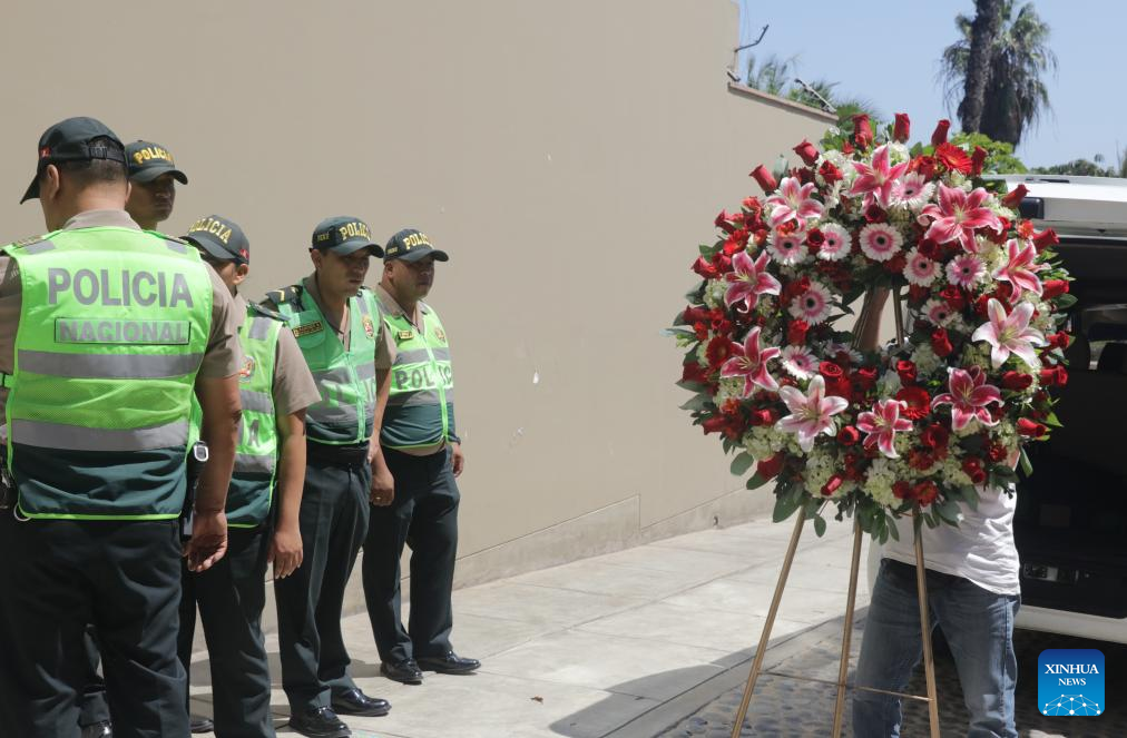Un trabajador transporta una corona de flores a la casa del fallecido escritor peruano y Premio Nobel de Literatura, Mario Vargas Llosa, en Lima, Perú, el 14 de abril de 2025. Vargas Llosa murió el domingo en la ciudad de Lima, a los 89 años de edad, informó su hijo Alvaro Vargas Llosa. (Xinhua/Mariana Bazo)