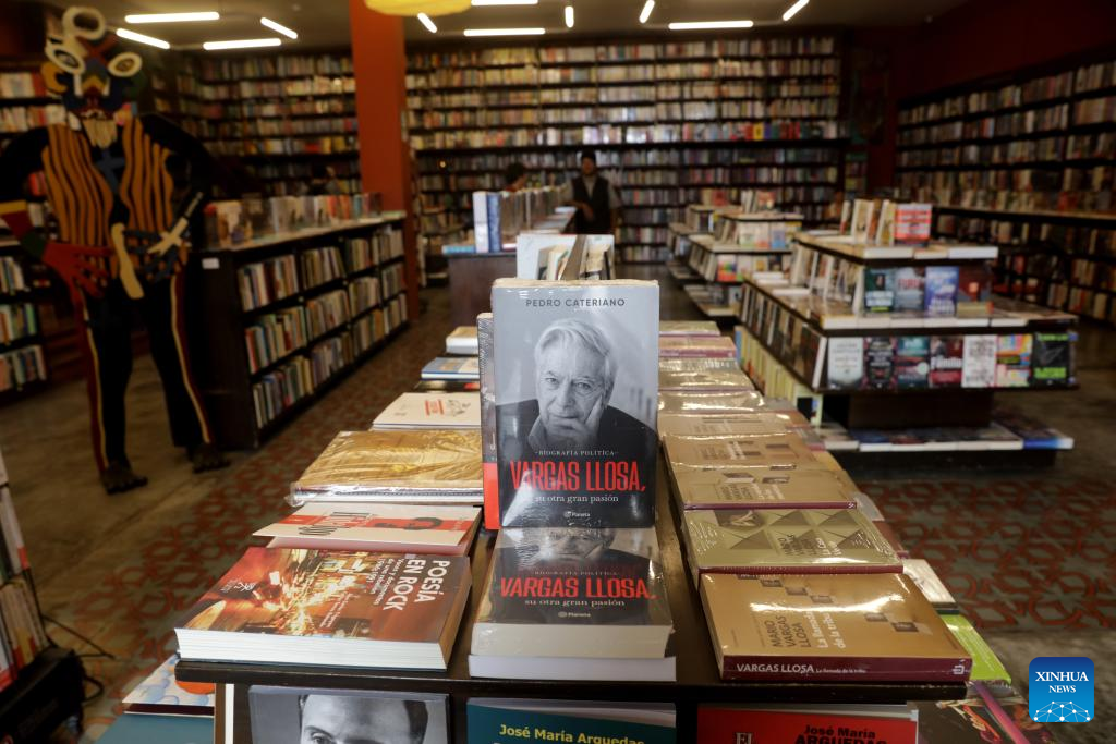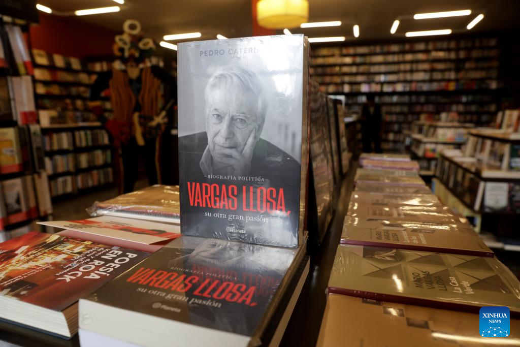 Imagen del 14 de abril de 2025 de un libro sobre el fallecido escritor peruano y Premio Nobel de Literatura, Mario Vargas Llosa, exhibido en una librería, en Lima, Perú. Vargas Llosa murió el domingo en la ciudad de Lima, a los 89 años de edad, informó su hijo Alvaro Vargas Llosa. (Xinhua/Mariana Bazo)