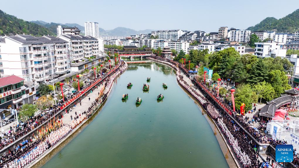 GUIYANG, 13 abril, 2025 (Xinhua) -- Vista aérea tomada con un dron el 13 de abril de 2025 de personas en trajes étnicos asistiendo a un evento de canto para celebrar el Festival de las Hermanas Miao, en el distrito de Taijiang, en la provincia de Guizhou, en el suroeste de China. El evento de canto se llevó a cabo aquí junto a un río el domingo, como parte de las celebraciones del Festival de las Hermanas Miao, un patrimonio cultural nacional inmaterial. (Xinhua/Tao Liang)