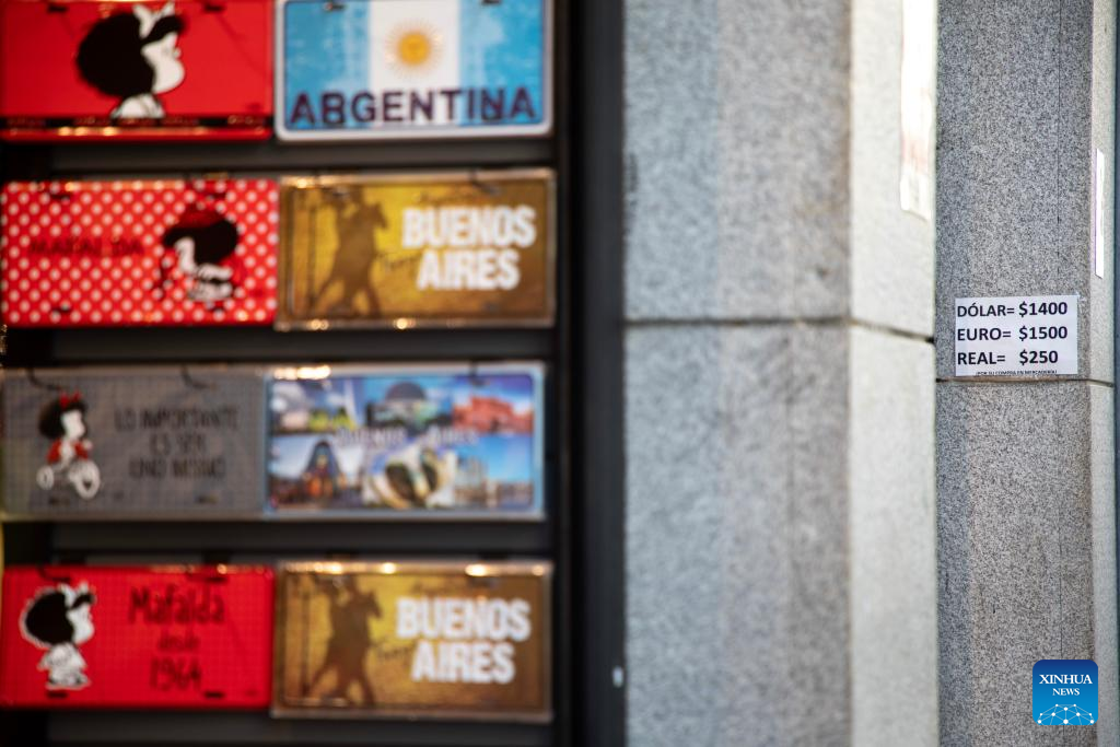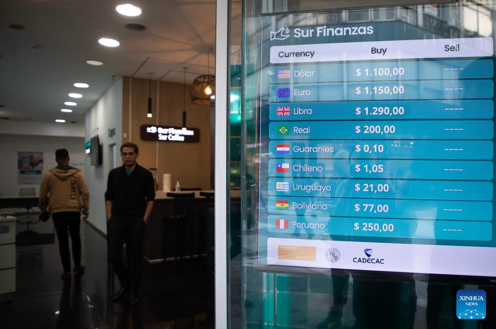 Un cartel muestra el valor de las divisas en un local comercial, en la ciudad de Buenos Aires, capital de Argentina, el 14 de abril de 2025. Argentina inició el lunes la primera jornada financiera sin control de cambios, tras la decisión del Gobierno de levantar el llamado "cepo" cambiario, en el marco de su estrategia para normalizar el mercado y atraer inversiones. (Xinhua/Martín Zabala)