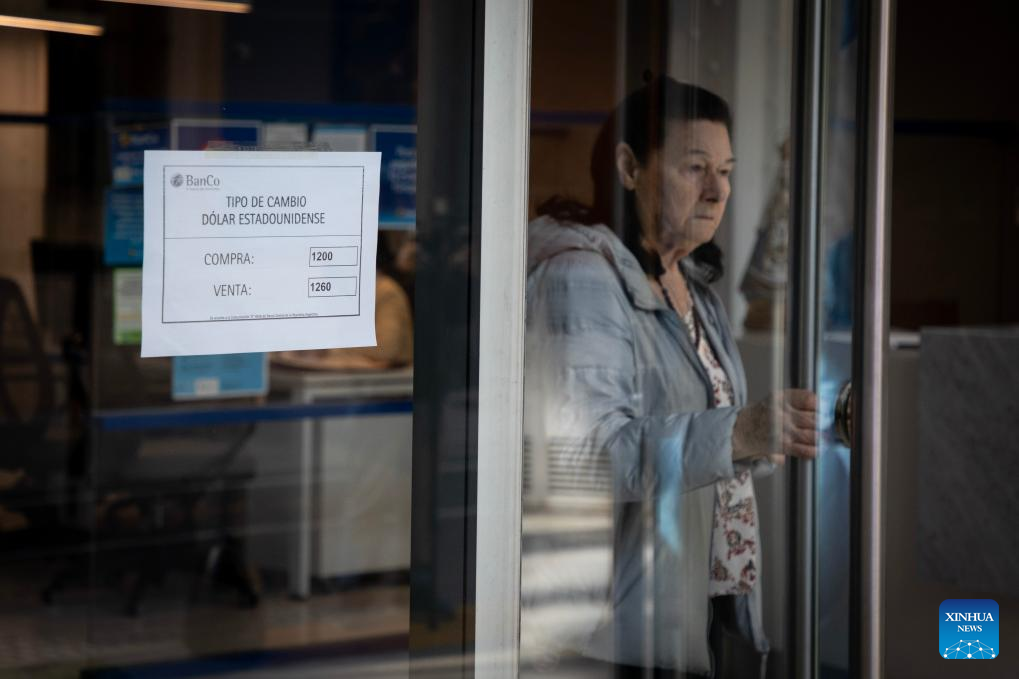 Una mujer camina junto a un letrero con la cotización oficial del dólar en una sucursal bancaria, en la ciudad de Buenos Aires, capital de Argentina, el 14 de abril de 2025. Argentina inició el lunes la primera jornada financiera sin control de cambios, tras la decisión del Gobierno de levantar el llamado "cepo" cambiario, en el marco de su estrategia para normalizar el mercado y atraer inversiones. (Xinhua/Martín Zabala)