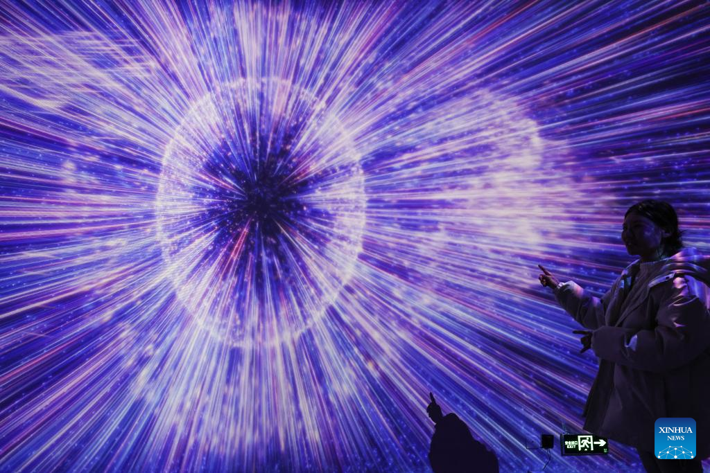 GUIYANG, 15 abril, 2025 (Xinhua) -- Imagen del 18 de febrero de 2025 de una turista visitando una sala de experiencias de realidad virtual en un poblado con temática astronómica, en el distrito de Pingtang, en la provincia de Guizhou, en el suroeste de China. Ubicado en la prefectura autónoma de las etnias buyi y miao de Qiannan, en la provincia de Guizhou, en el suroeste de China, el distrito de Pingtang presenta un terreno más elevado en el noroeste y más bajo en el sureste, con una diferencia de altitud relativa de más de 1.000 metros. Con más de 2.455,23 kilómetros cuadrados de paisaje kárstico, el distrito de Pingtang también alberga el Radiotelescopio Esférico de Apertura de Quinientos Metros de China. (Xinhua/Ou Dongqu)