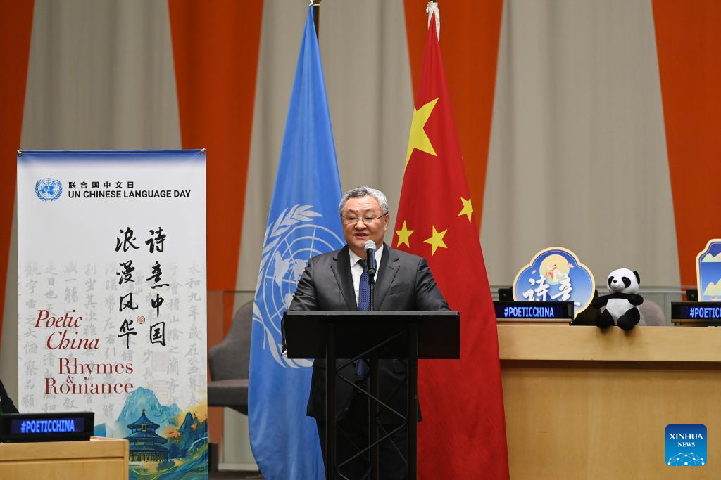 NACIONES UNIDAS, 16 abril, 2025 (Xinhua) -- Fu Cong, representante permanente de China ante la Organización de las Naciones Unidas (ONU), habla durante un evento conmemorativo del 16º Día del Idioma Chino de la ONU, en la sede de la ONU, en Nueva York, el 15 de abril de 2025. La ONU celebró su 16º Día del Idioma Chino el martes en su sede de Nueva York, ofreciendo una experiencia cultural inmersiva que fusionó la poesía y la música chinas. El evento de este año, "China Poética: Rimas y Romance", incluyó lecturas de poesía china, actuaciones musicales y una exposición sobre caracteres chinos. Más de 400 diplomáticos de la ONU, personal e invitados internacionales asistieron al evento. (Xinhua/Li Rui)