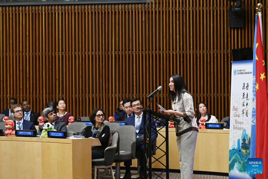 NACIONES UNIDAS, 16 abril, 2025 (Xinhua) -- Imagen del 15 de abril de 2025 de una representante de la Misión Permanente de Italia ante las Naciones Unidas leyendo el poema "Una mañana de primavera" durante un evento conmemorativo del 16º Día del Idioma Chino de la Organización de las Naciones Unidas (ONU) , en la sede de la ONU, en Nueva York. La ONU celebró su 16º Día del Idioma Chino el martes en su sede de Nueva York, ofreciendo una experiencia cultural inmersiva que fusionó la poesía y la música chinas. El evento de este año, "China Poética: Rimas y Romance", incluyó lecturas de poesía china, actuaciones musicales y una exposición sobre caracteres chinos. Más de 400 diplomáticos de la ONU, personal e invitados internacionales asistieron al evento. (Xinhua/Li Rui)