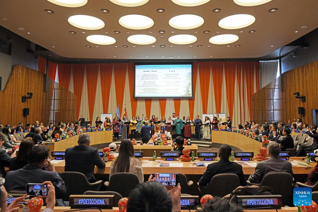 NACIONES UNIDAS, 16 abril, 2025 (Xinhua) -- Imagen del 15 de abril de 2025 de cantantes de la Organización de las Naciones Unidas (ONU), que portan trajes tradicionales, interpretando la emblemática canción popular china "Jazmín" durante un evento conmemorativo del 16º Día del Idioma Chino de la ONU, en la sede de la ONU, en Nueva York. La ONU celebró su 16º Día del Idioma Chino el martes en su sede de Nueva York, ofreciendo una experiencia cultural inmersiva que fusionó la poesía y la música chinas. El evento de este año, "China Poética: Rimas y Romance", incluyó lecturas de poesía china, actuaciones musicales y una exposición sobre caracteres chinos. Más de 400 diplomáticos de la ONU, personal e invitados internacionales asistieron al evento. (Xinhua/Li Rui)