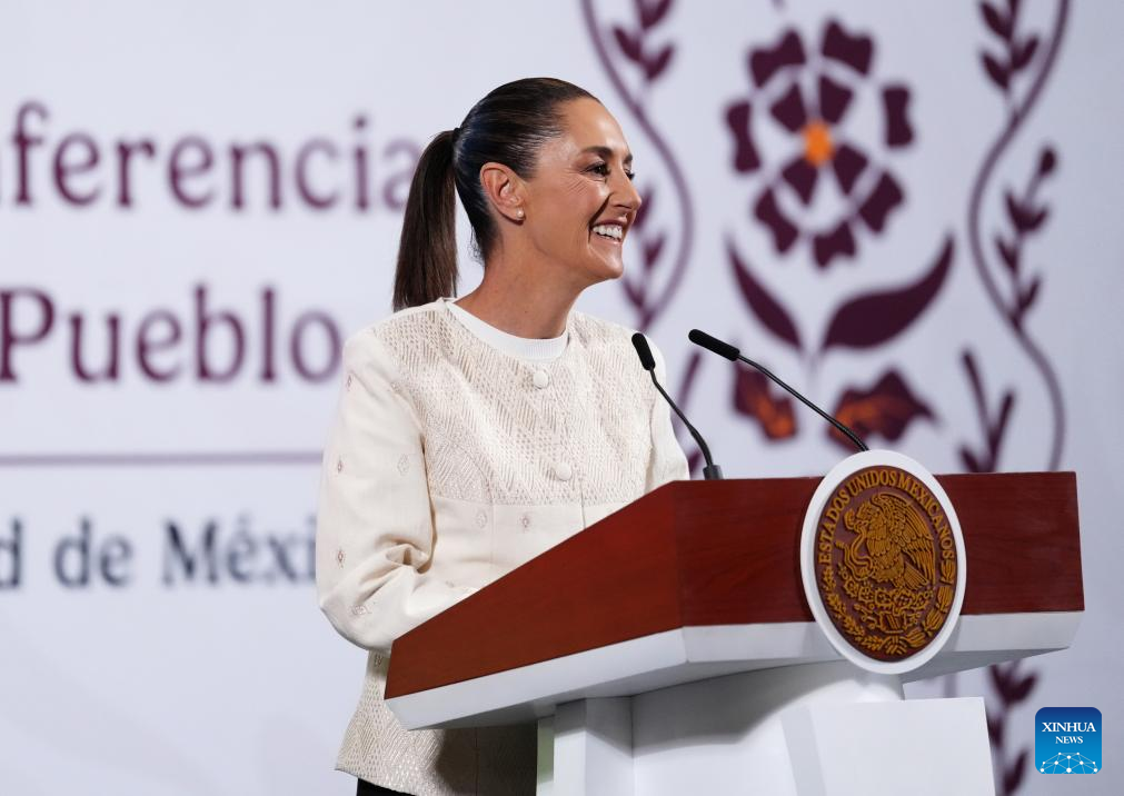 CIUDAD DE MEXICO, 16 abril, 2025 (Xinhua) -- Imagen cedida por la Presidencia de México de la presidenta mexicana, Claudia Sheinbaum, sonriendo durante su conferencia de prensa matutina, en Palacio Nacional, en la Ciudad de México, capital de México, el 16 de abril de 2025. La decisión del Gobierno de Estados Unidos de establecer bases militares en su territorio fronterizo con el país latinoamericano para frenar la migración irregular es un acto de soberanía interna estadounidense, expuso el miércoles Sheinbaum quien agregó que la nación ya expresó su postura a través de una nota diplomática. (Xinhua/Presidencia de México)