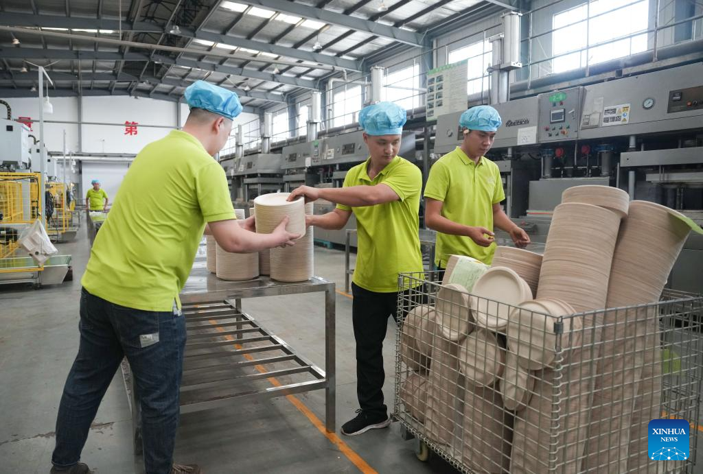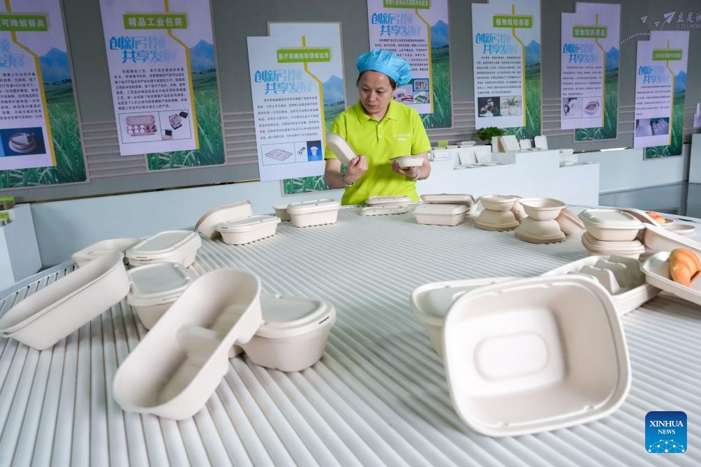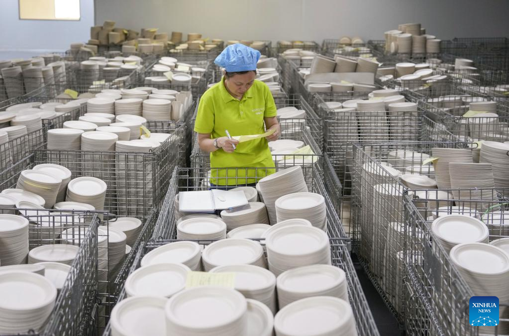 LINCANG, 16 abril, 2025 (Xinhua) -- Imagen del 15 de abril de 2025 de una trabajadora revisando productos de vajilla degradables en un taller de embalaje de una empresa de nuevos materiales, en la ciudad de Lincang, en la provincia de Yunnan, en el suroeste de China. Basándose en sus 400.000 mu (26.666,67 hectáreas) de campos de plantación de caña de azúcar, el distrito autónomo dai y va de Gengma de la ciudad de Lincang se ha centrado en el desarrollo de vajillas degradables y ecológicas con bagazo, el residuo generado durante el prensado del azúcar. Estos productos han ganado popularidad en países extranjeros como Alemania e Italia. Actualmente, el valor de producción anual de sus vajillas degradables se acerca a los 100 millones de yuanes (aproximadamente 13,65 millones de dólares estadounidenses), lo que supone un gran impulso para la economía y el empleo locales. (Xinhua/Chen Xinbo)