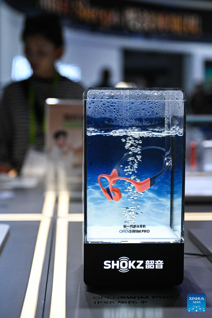 HAIKOU, 16 abril, 2025 (Xinhua) -- Imagen del 15 de abril de 2025 de auriculares impermeables para nadar en la V Exposición Internacional de Productos de Consumo de China (CICPE, por sus siglas en inglés), en Haikou, en la provincia de Hainan, en el sur de China. Desde habilidades de patrimonio cultural inmaterial hasta productos tecnológicos de moda, las marcas chinas mostraron su encanto en la CICPE en curso en Haikou, atrayendo la atención de muchos visitantes. (Xinhua/Pu Xiaoxu)