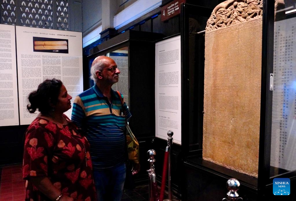 COLOMBO, 17 abril, 2025 (Xinhua) -- Visitantes observan la Inscripción Trilingüe en el Museo Nacional de Colombo, en Colombo, Sri Lanka, el 17 de abril de 2025. Tres colecciones de patrimonio documental presentadas por China han sido inscritas en el Registro de la Memoria del Mundo de la UNESCO, anunció el jueves la Organización de las Naciones Unidas para la Educación, la Ciencia y la Cultura. Entre las 74 nuevas entradas agregadas, China contribuyó con dos presentaciones individuales: el Bianzhong del Marqués Yi de Zeng y las Estelas del Templo Shaolin, así como una presentación conjunta con Sri Lanka: la Inscripción Trilingüe. (Xinhua/Wu Yue)