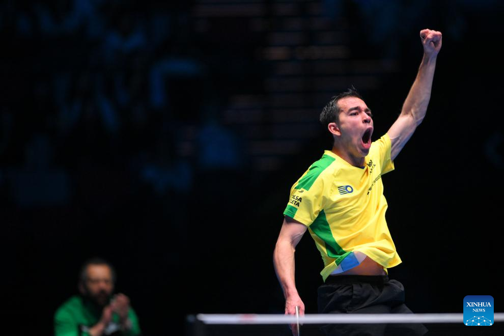 MACAO, 18 abril, 2025 (Xinhua) -- Hugo Calderano festeja un punto durante el partido de cuartos de final de individuales masculinos entre Harimoto Tomokazu, de Japón, y Hugo Calderano, de Brasil, en la Copa del Mundo Masculina y Femenina de la ITTF 2025, en Macao, China, el 18 de abril de 2025. (Xinhua/Cheong Kam Ka)