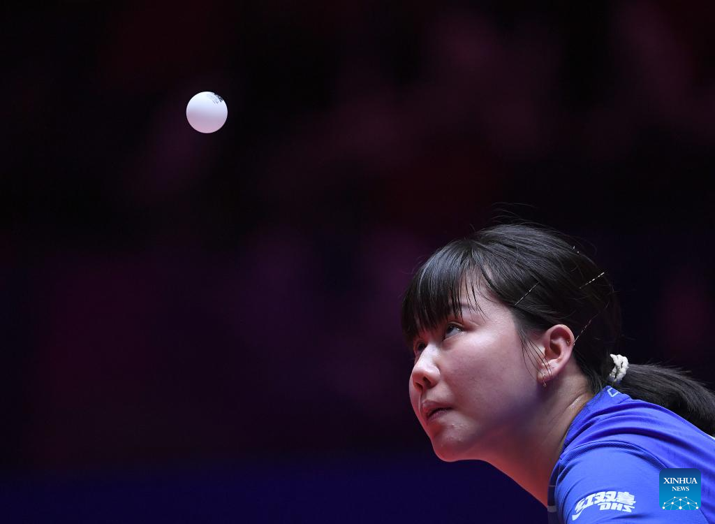 MACAO, 18 abril, 2025 (Xinhua) -- Chen Xingtong, de China, sirve la pelota durante el partido de cuartos de final de individuales femeninos entre Chen Xingtong, de China, y Bruna Takahashi, de Brasil, en la Copa del Mundo Masculina y Femenina de la ITTF 2025, en Macao, China, el 18 de abril de 2025. (Xinhua/Chen Duo)