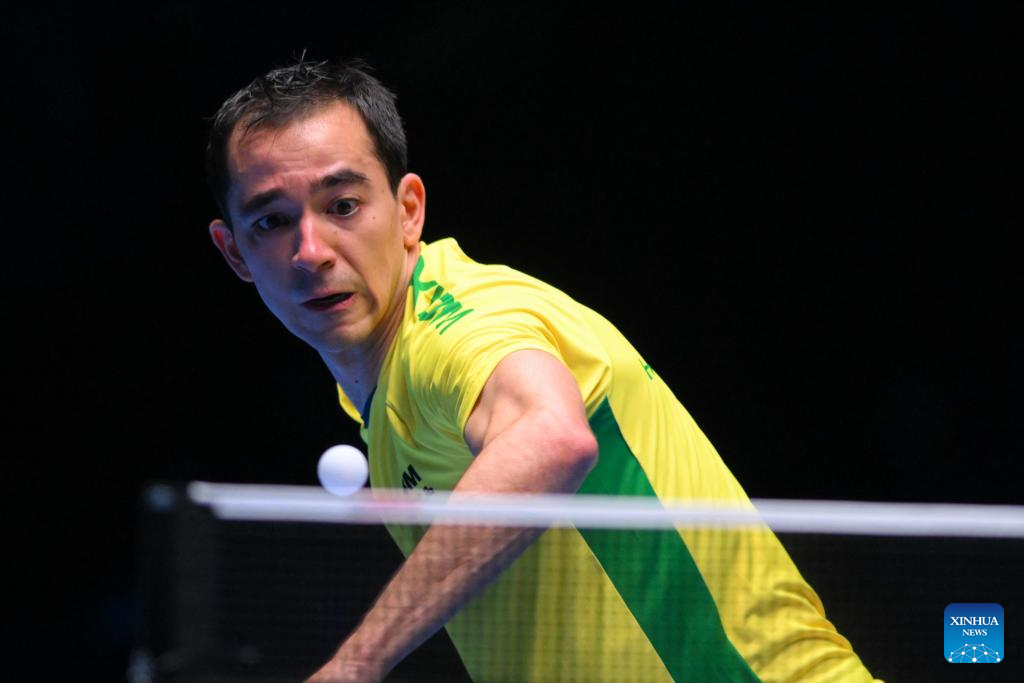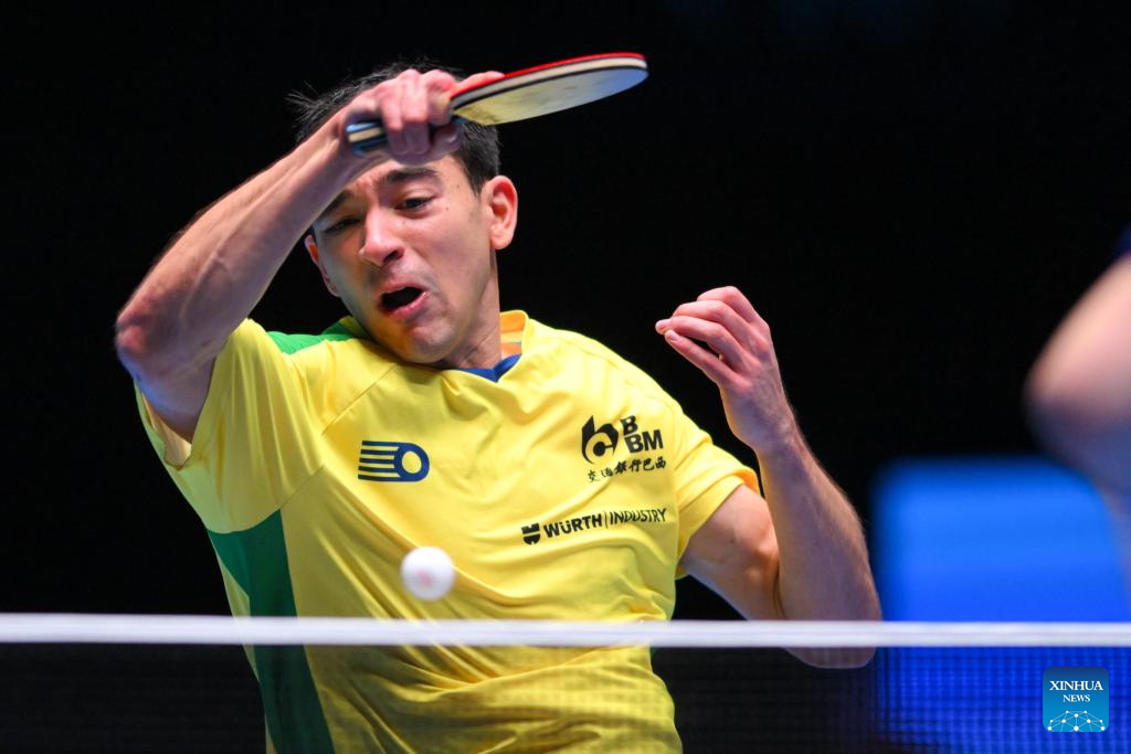 MACAO, 18 abril, 2025 (Xinhua) -- Hugo Calderano compite durante el partido de cuartos de final de individuales masculinos entre Harimoto Tomokazu, de Japón, y Hugo Calderano, de Brasil, en la Copa del Mundo Masculina y Femenina de la ITTF 2025, en Macao, China, el 18 de abril de 2025. (Xinhua/Cheong Kam Ka)