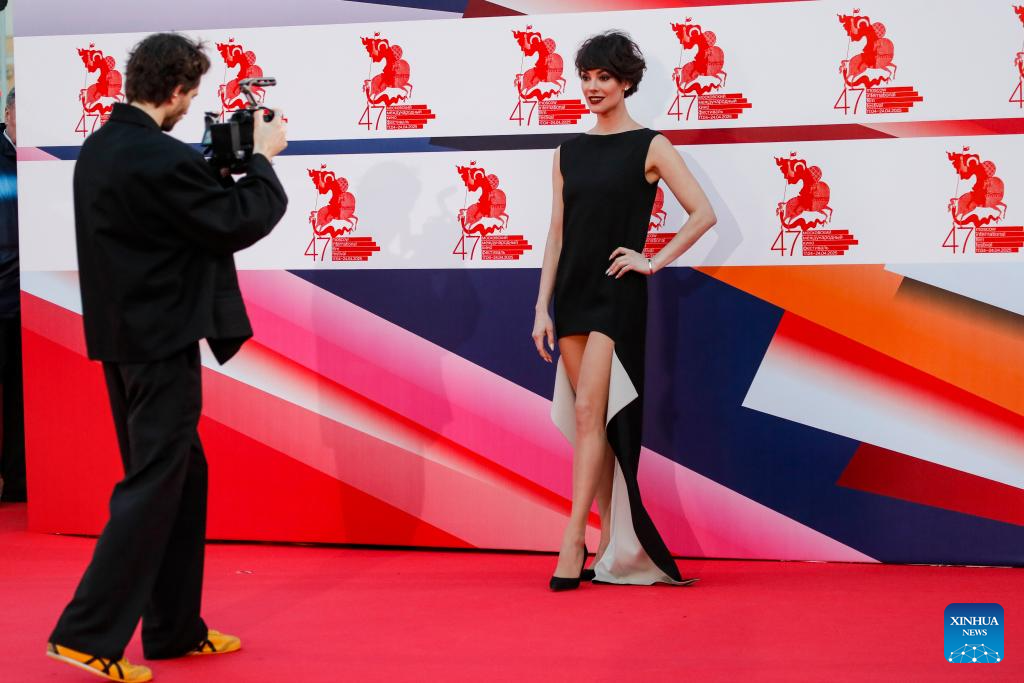 MOSCU, 18 abril, 2025 (Xinhua) -- Imagen del 17 de abril de 2025 de una invitada posando para fotografías mientras llega para asistir a la ceremonia de apertura del 47° Festival Internacional de Cine de Moscú, en Moscú, Rusia. El 47° Festival Internacional de Cine de Moscú se inauguró el jueves en la capital rusa, con un programa cinematográfico dedicado al grupo BRICS. (Xinhua/Alexander Zemlianichenko Jr)