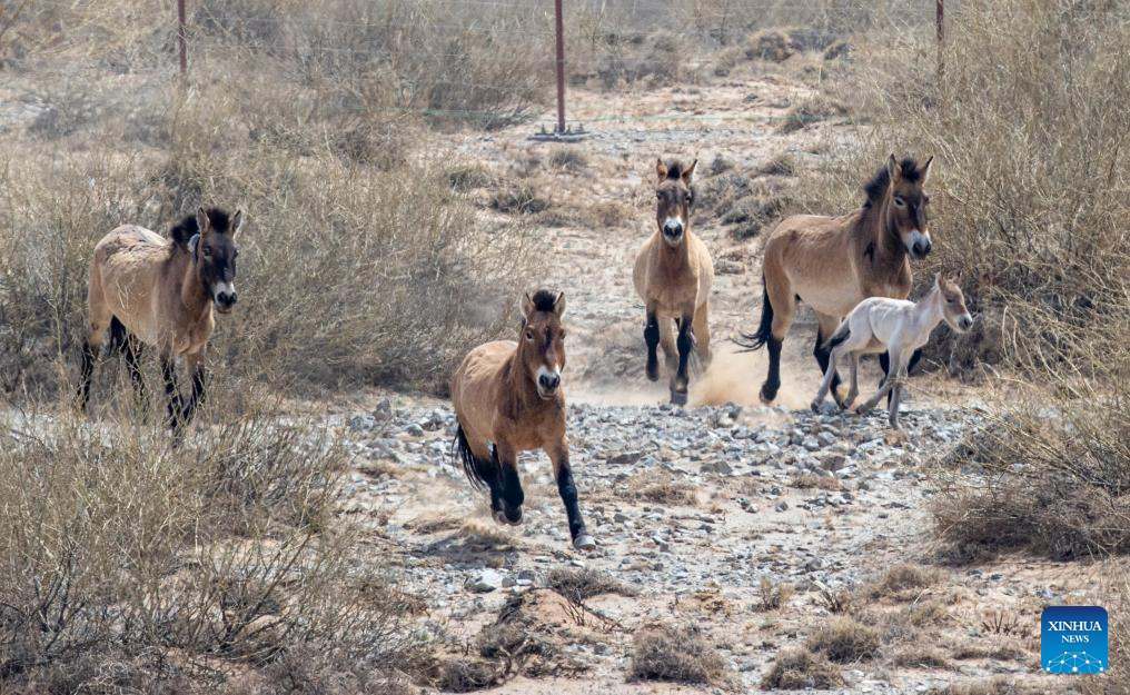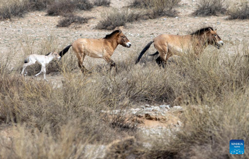SHIZUISHAN, 18 abril, 2025 (Xinhua) -- Imagen del 17 de abril de 2025 de caballos de Przewalski y un potro vistos en la Reserva Natural de la Montaña de Helan, en la región autónoma hui de Ningxia, en el noroeste de China. El caballo de Przewalski está clasificado como especie en peligro de extinción por la Lista Roja de Especies Amenazadas de la Unión Internacional para la Conservación de la Naturaleza y se encuentra bajo protección nacional de primera clase. (Xinhua/Yang Zhisen)