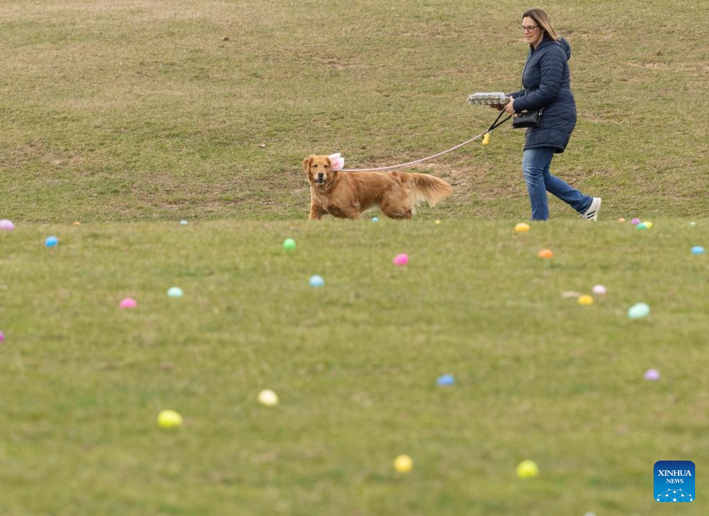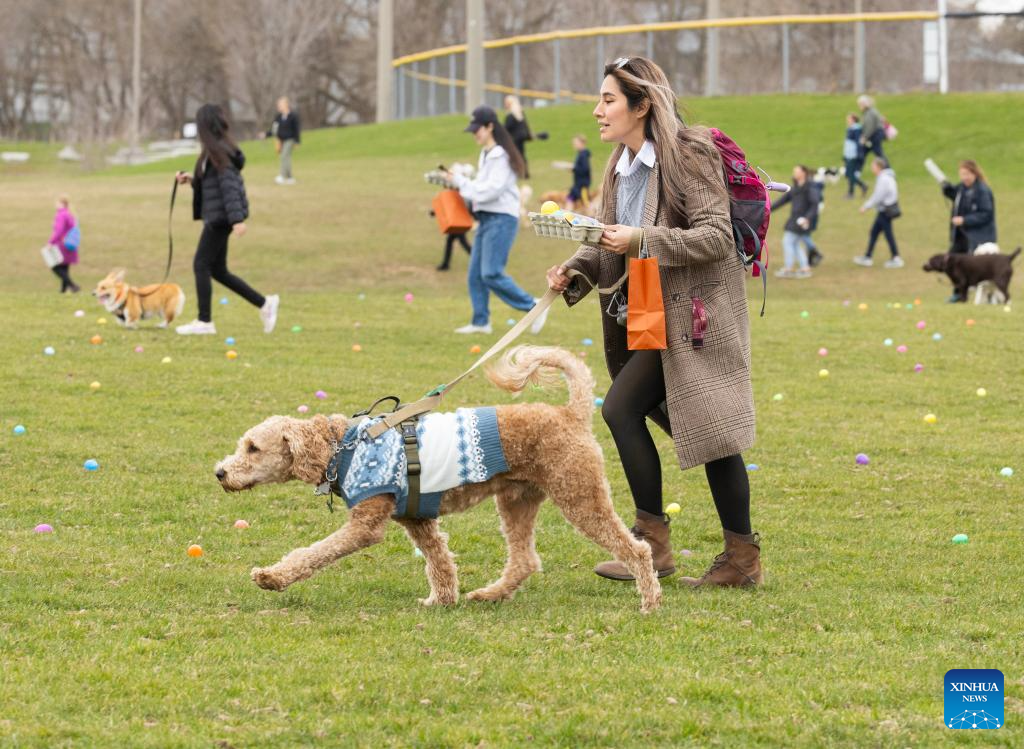 HAMILTON, 18 abril, 2025 (Xinhua) -- Un perro mascota busca huevos junto a su dueña durante la Búsqueda de Huevos de Pascua para Perros 2025, en Hamilton, Ontario, Canadá, el 18 de abril de 2025. (Xinhua/Zou Zheng)